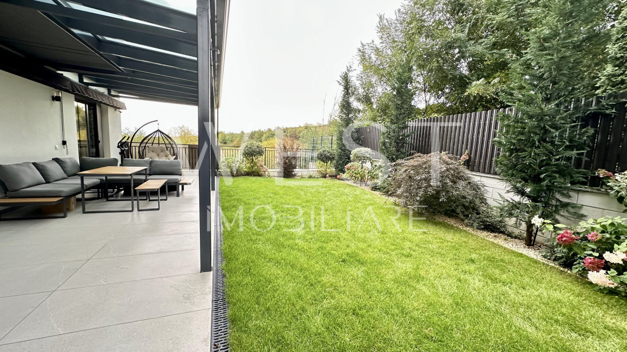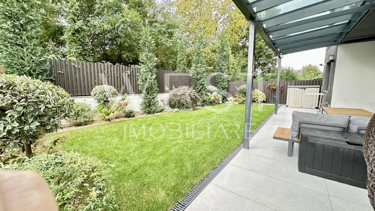 Grădina este amenajată cu arbuști ornamentali , gazon , pergola și mobilier de exterior!
